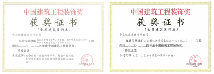 大會(huì)發(fā)布了2023年度中國(guó)建筑裝飾協(xié)會(huì)行業(yè)綜合數(shù)據(jù)統(tǒng)計(jì)報(bào)告,并頒發(fā)了2023-2024年度第一批中國(guó)建筑工程裝飾獎(jiǎng)。中啟膠建集團(tuán)建筑七公司承建的康復(fù)大學(xué)項(xiàng)目學(xué)部、體育館、國(guó)際學(xué)術(shù)交流中心等部分(工程總承包)(學(xué)部工程);建筑九公司承建的山東科技大學(xué)圖書信息中心(施工)兩個(gè)項(xiàng)目入選。